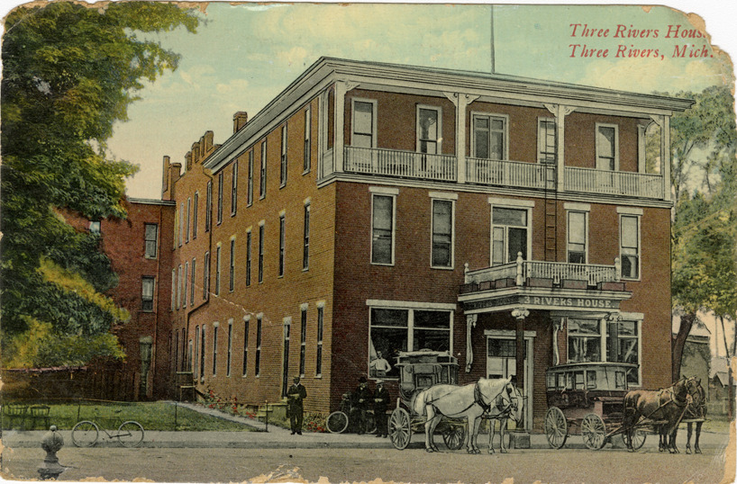 Favorite this☆ Three Rivers House, Three Rivers, Michigan Description: View of the Three Rivers House at Three Rivers, Michigan. Horse-drawn carriages in front of hotel. Printed on front: "Three Rivers House, Three Rivers, Mich." Printed on back: "S.124. Wolverine News Co., Detroit, Mich. Printed in Belgium." Details Resource ID: bh022070 Subject: Hotels--Michigan--Three Rivers Horse-drawn vehicles--Michigan--Three Rivers Postcards Publisher: Wolverine News Co. Date Issued: Unknown year Format: 1 postcard : col. ; 3.5 x 5.5 in. Member of: Burton Historical Collection Filing Location: M/Localities-Three Rivers Rights: Physical rights are retained by DPL. Copyright is retained in accordance with U.S. copyright laws.