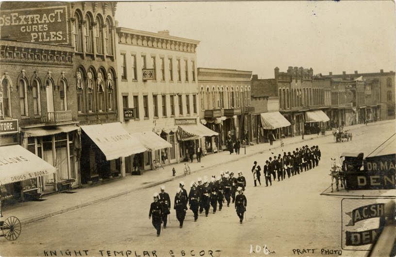 View of members of the Knights Templar, in uniform, marching down street in Three Rivers, Michigan. Commercial buildings in background. Printed on front: "Knight [sic] Templar escort, 106, Pratt photo."
