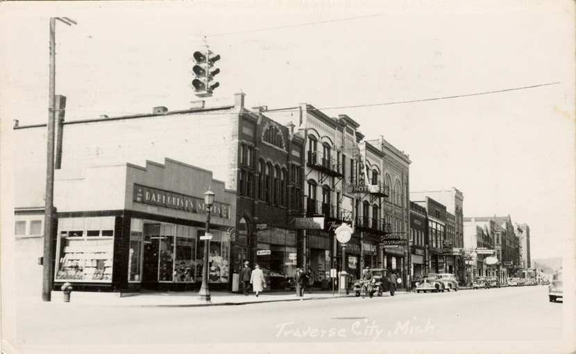 View of commercial buildings and cars on an unidentified street in Traverse City, Michigan. Printed on front: "Traverse City, Mich." Printed on back: "Charles J. Herbert, Traverse City, Michigan." Handwritten message on back. Card is postmarked September 19, 1951.
