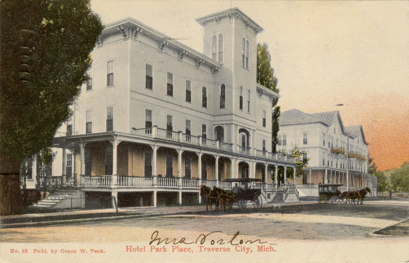 View of the Park Place Hotel in Traverse City, Michigan. Printed on front: "Hotel Park Place, Traverse City, Mich. No. 52, publ. by Orson W. Peck." Handwritten on back: "August 10, 1907. My dear friend, This is the hotel my Uncle is manager of. We arrived here last Thursday noon and leave here Monday morning. I am having a lovely time and such lovely weather. Lovingly, Mrs. L.T. Horton." Card is postmarked August 11, 1907.