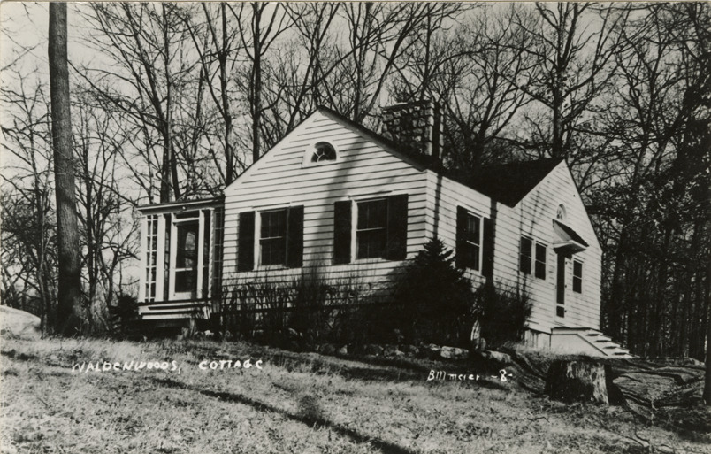 View of a wooden-frame cottage at the Waldenwoods resort in Hartland, Michigan. Printed on front: "Waldenwoods cottage. Billmeier, 8."