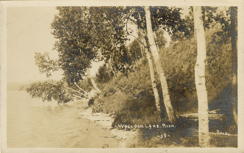 View of the shoreline of Walloon Lake in Charlevoix County, Michigan. Printed on front: "Walloon Lake, Mich. Beebe." Handwritten on back: "Dear Aunt Pearl, Mamma and I and a friend of ours have come down here for the day. The assembly closed yesterday and so we are seeing some of the surrounding country now. I will write soon. Lovingly, Pearl." Card is postmarked August 20, 1917.