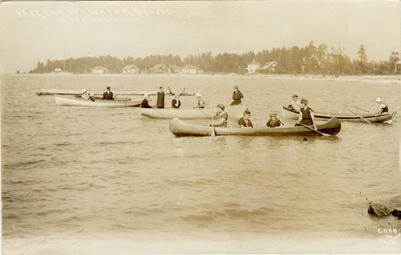 Favorite this☆ Men and women in canoes, Wawatam Beach, Mackinaw City, Michigan Description: View of men and women paddling canoes at Wawatam Beach in Mackinaw City, Michigan. Printed on front: "Copr. Clyde Johnson." Details Resource ID: bh022170 Creator: Johnson, Clyde Subject: Canoes and canoeing--Michigan--Mackinaw City Canoeists--Michigan--Mackinaw City Photographers--Michigan Photographic prints Postcards Date Issued: Unknown year Format: 1 postcard ; 3.5 x 5.5 in. Member of: Burton Historical Collection Filing Location: M/Localities-Wawatam Beach Rights: Physical rights are retained by DPL. Copyright is retained in accordance with U.S. copyright laws.