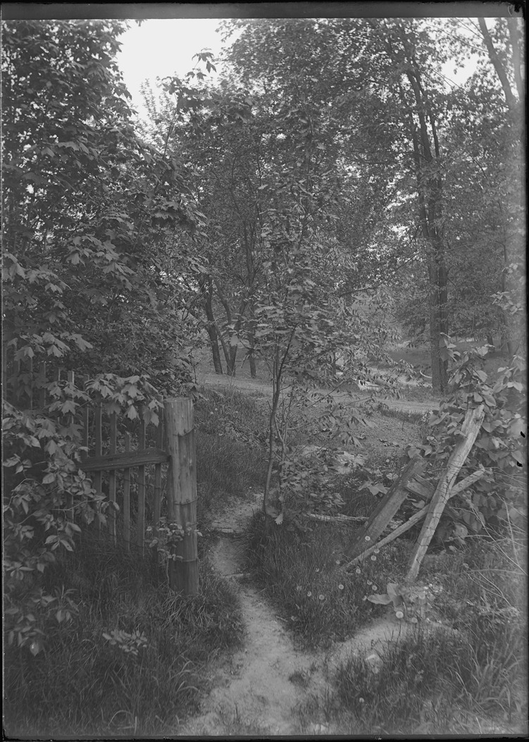 View of a footpath through a wooden fence in Farmington, Michigan. Handwritten on sleeve: "The stile, Farmington. May 30, 1909."