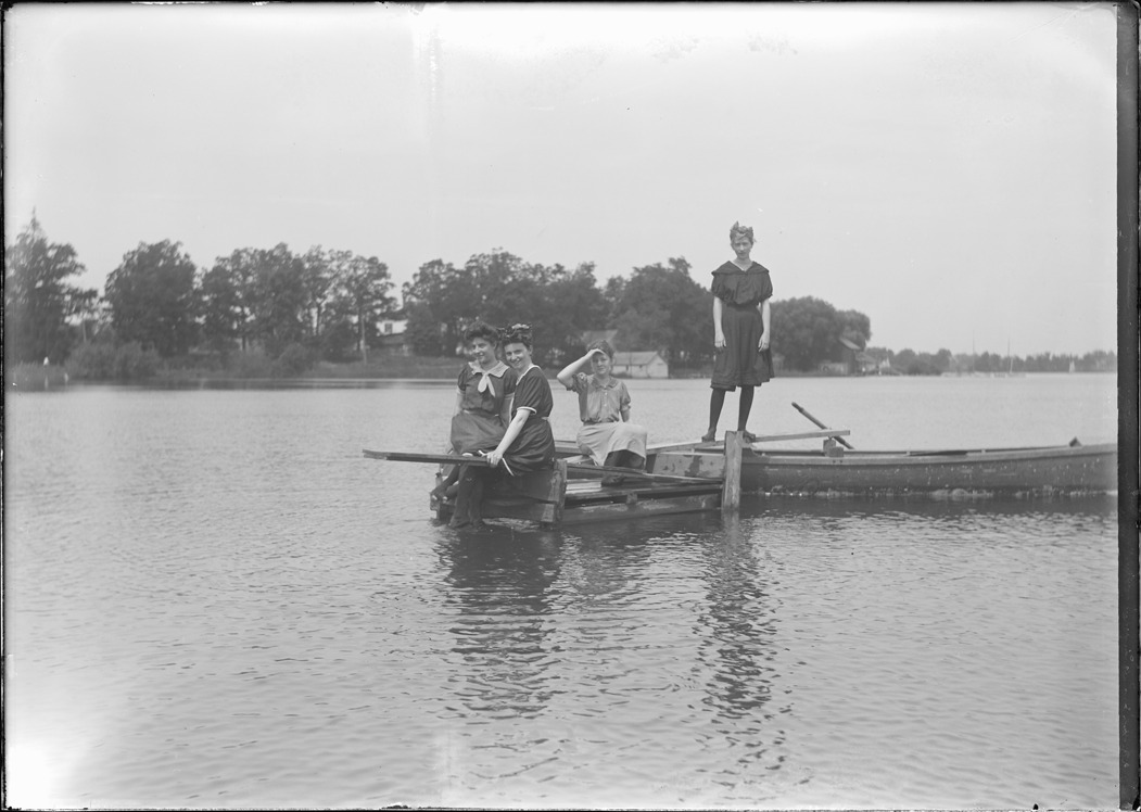View of four girls, wearing swimsuits, posing on springboard at Whitmore Lake in Whitmore Lake, Michigan. Handwritten on sleeve: "Girls bathing (Lottie on springboard), Whitmore Lake. Aug. 19/27, 1905."