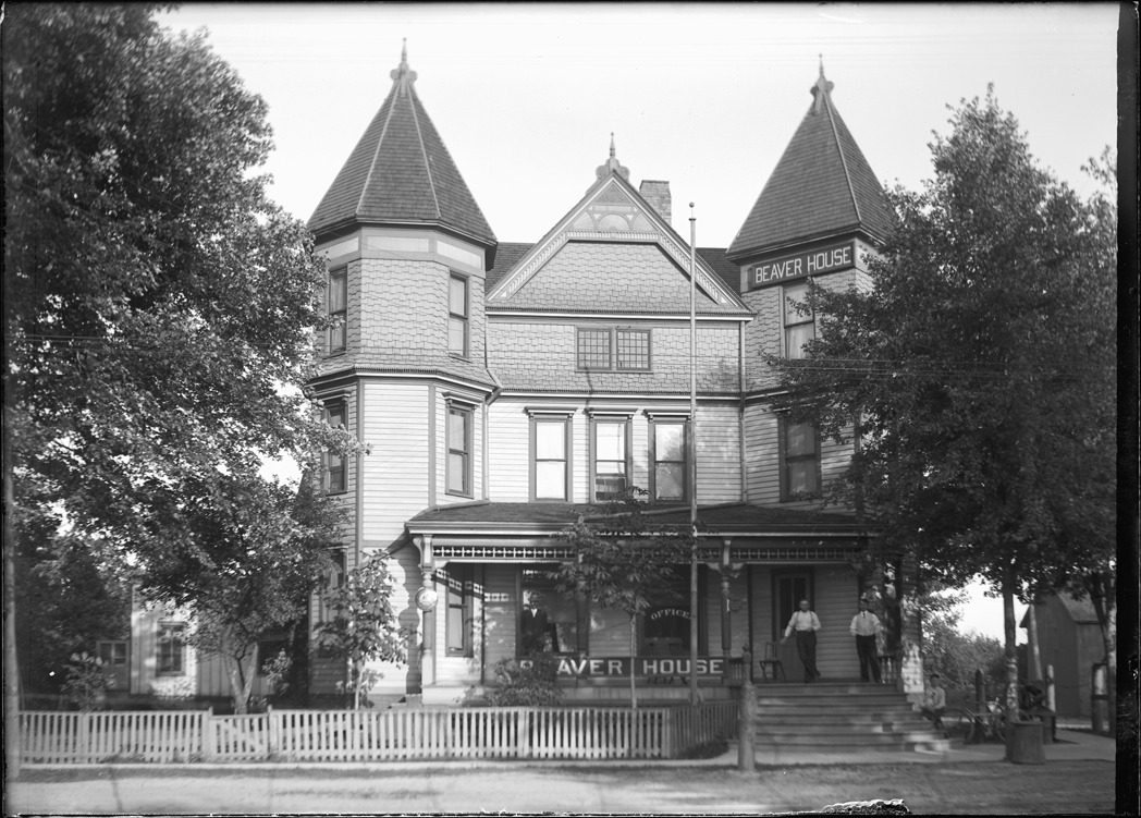 View of men posing on the porch of the Beaver House hotel in Sandwich (now Windsor), Ontario. Handwritten on sleeve: "Beaver House (hotel), Sandwich, Aug. 18, 1908."