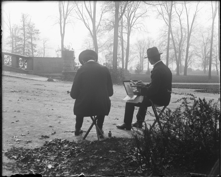 Favorite this☆ Artists painting on Belle Isle Description: View of two men, sitting on stools near bridge, painting on Belle Isle. One man holds a paintbrush and painter's palette. Handwritten on sleeve: "Two artists, Belle Isle. Nov. 1907." Details Resource ID: bh022347 Subject: Artists--Michigan--Detroit Belle Isle Park (Detroit, Mich.) Glass negatives Date Issued: 1907-11 Format: 1 negative : glass ; 4 x 5 in. Member of: Burton Historical Collection Filing Location: Heath Collection Negative Number: 315 Rights: Physical rights are retained by DPL. Copyright is retained in accordance with U.S. copyright laws.