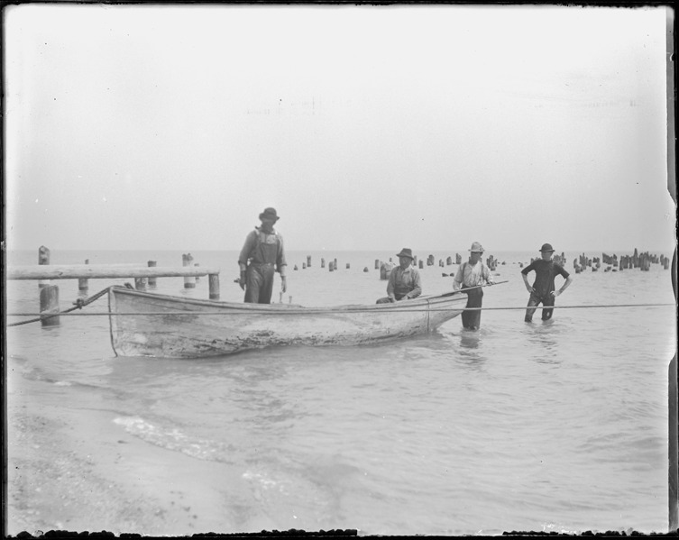 View of several men wading next to a rowboat near lakeshore. Handwritten on sleeve: "Rafting logs in a boat, lakefront. July, 1902."