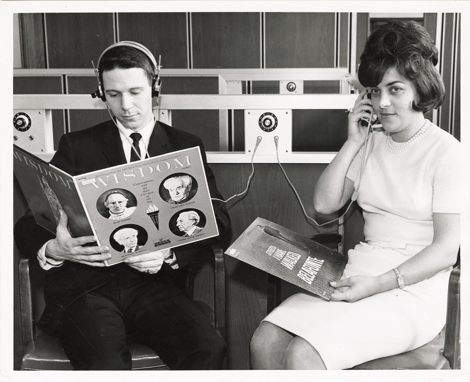 View of a man and woman listening to audio recordings at a listening station in the Music and Performing Arts room, Main Library, Detroit Public Library. Phonograph records are "Streets I have walked, Harry Belafonte" and "Wisdom: conversations with the elder wise men of our day." Label on back: "Detroit Public Library. Auditing records in Music and Performing Arts Dept. Photo: Nat'l Bank of Detroit."