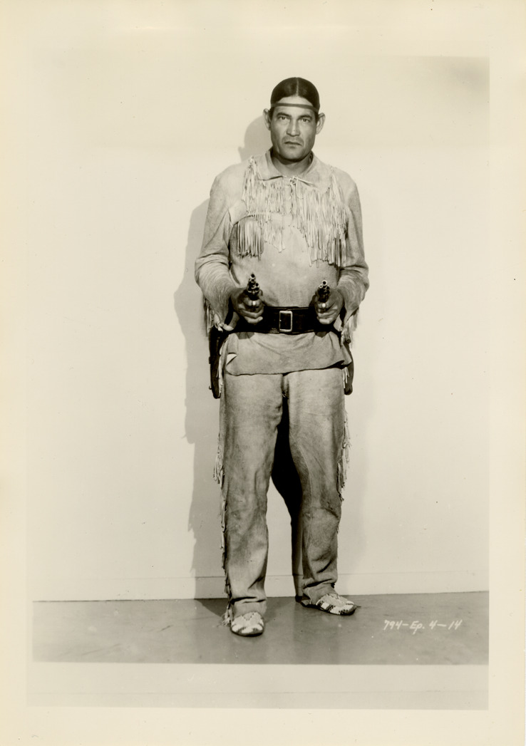 View of an actor dressed as Tonto, posing with two pistols. Printed on front: "794-Ep. 4-14." Label on back: "8. Tonto."