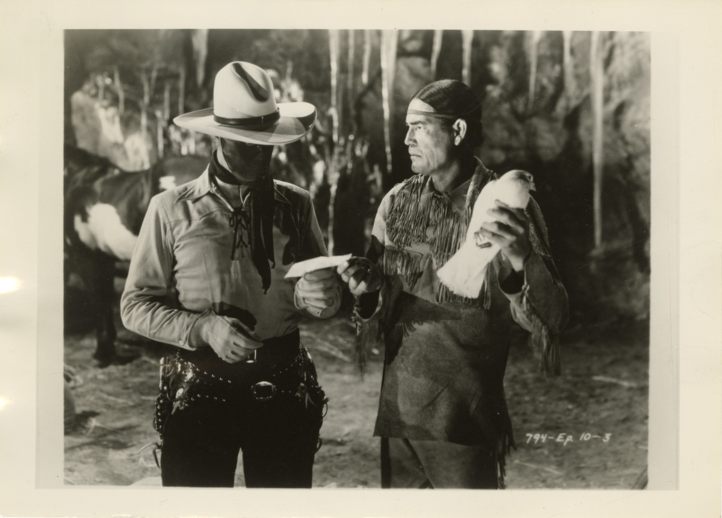 View of the Lone Ranger and Tonto, intercepting a message from a carrier pigeon. Printed on front: "794-Ep. 10-3." Label on back: "3. The Lone Ranger and Tonto intercept a message when a carrier pigeon falls exhausted."