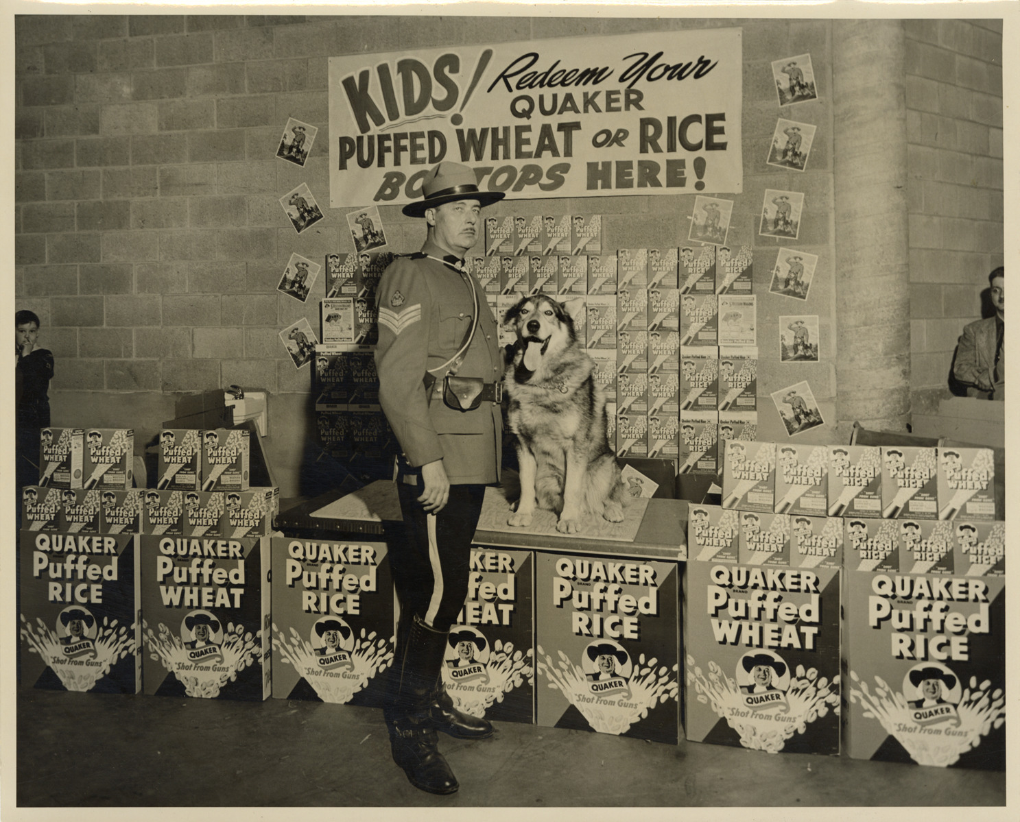 View of an actor costumed as "Sergeant Preston of the Yukon" posing with his dog, Yukon King, in front of a display of Quaker puffed cereal boxes. Sign in background reads: "Kids! Redeem your Quaker puffed wheat or rice box tops here!" Stamped on back: "Watters Studio, portrait and commercial photography. Phone H-9941. 2223 Miner St., Fort Wayne, Ind. Reorder no. [blank]."