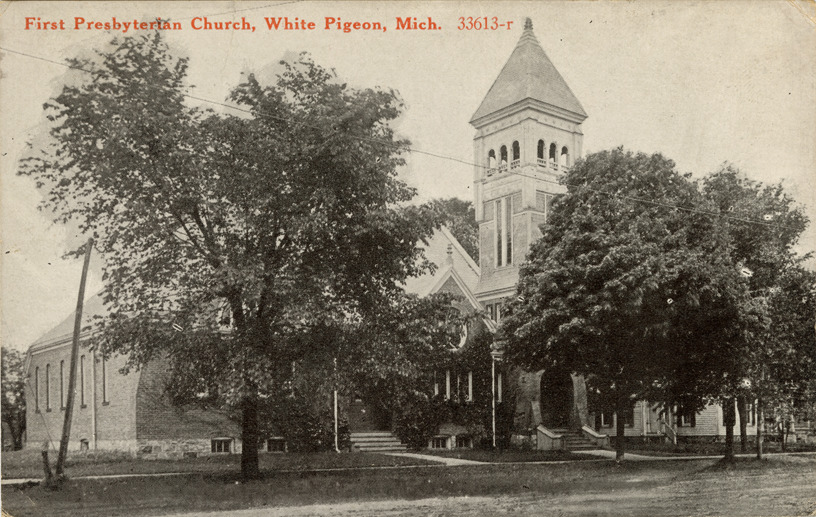 View of the First Presbyterian Church in White Pigeon, Michigan. Printed on front: "First Presbyterian Church, White Pigeon, Mich. 33613-r." Printed on back: "C.R. Childs Company. Made in U.S.A." Handwritten on back: "I have just found out by comparison of handwriting, that a Xmas card without any name came from you. At least I suppose so I thank you for it. Hope you are all well. I am very well. Anne's boy in nearly 7 months old, & a fine little chap. Best wishes for you all for the New Year. Jan. 10/19. [undecipherable] Will S.J." Card is postmarked January 11, 1919.