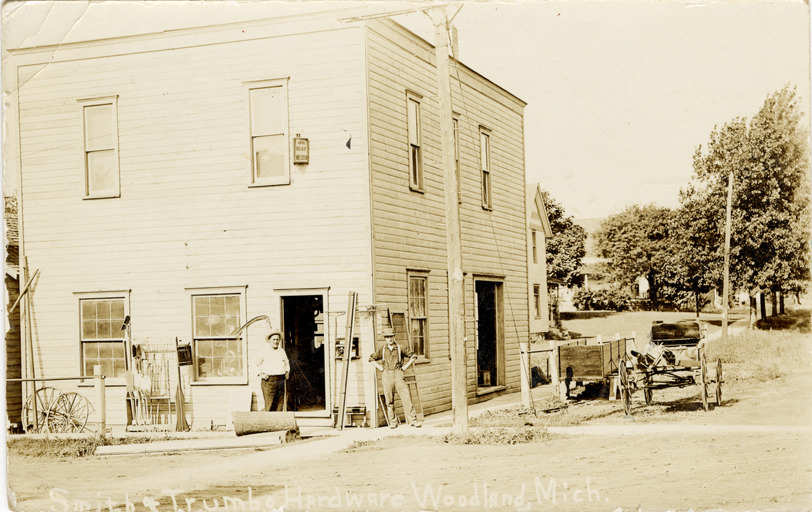 View of men posing in front of the Smith & Trumbo hardware store in Woodland, Michigan. Handwritten on back: "Dear Friends, We are sending our best wishes for a happy birthday. We got home from Fostoria this week, missed you so much. We sincerely hope your health is improved, I have been sick all summer with inflammatory rheumatism, for weeks wasn't able to walk, but am much better. Milan likes his work fine, Gertrude is a big girl, starts to school next Tues. Write sometime, Fern. Woodland, Mich." Card is postmarked September 2, 1916.