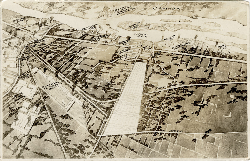 Artist's depiction of a bird's-eye view of Wyandotte, Michigan. Detroit River in background. Printed on back: "Sample photo, reproduction from a drawing showing birdseye view of an allotment in Detroit from the Art Studios of the Canton Engraving and Electrotype Co., Canton, Ohio. Are you interested in a birdseye of your new allotment? Write us for further samples and prices." Handwritten on back: "Michigan, Wyandotte, 1920."