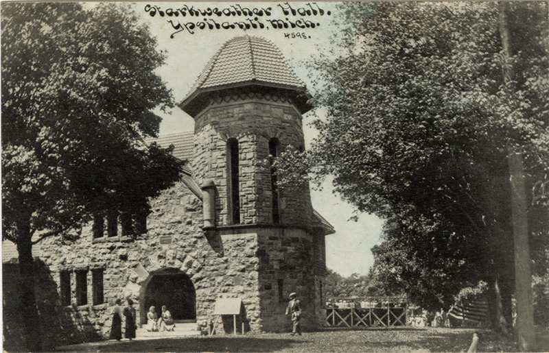 View of Starkweather Hall on the campus of Eastern Michigan University in Ypsilanti, Michigan. Printed on front: "Starkweather Hall, Ypsilanti, Mich." Handwritten on back: "Oct the 4, 1911. Dear May, I got your card alright. Sunday rained from early in the morning till after evening service. One Sundy [sic] while you have been gone Edna came and staid [sic] with us to dinner and all the afternoon we had a nice visit. I have canned over forty quarts of fruit. I am quite tired but we have some sauce. Good by, bless you, Mother."