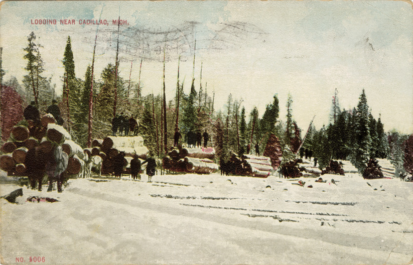 View of loggers transporting cut logs on horse-drawn sledges at Cadillac, Michigan. Printed on front: "Logging near Cadillac, Mich." Handwritten on back: "Monday. Arrived here at 6 p.m. and will leave for Pentwater Tuesday a.m. Has been raining most all day here, Sullie." Card is postmarked August 11, 1917.