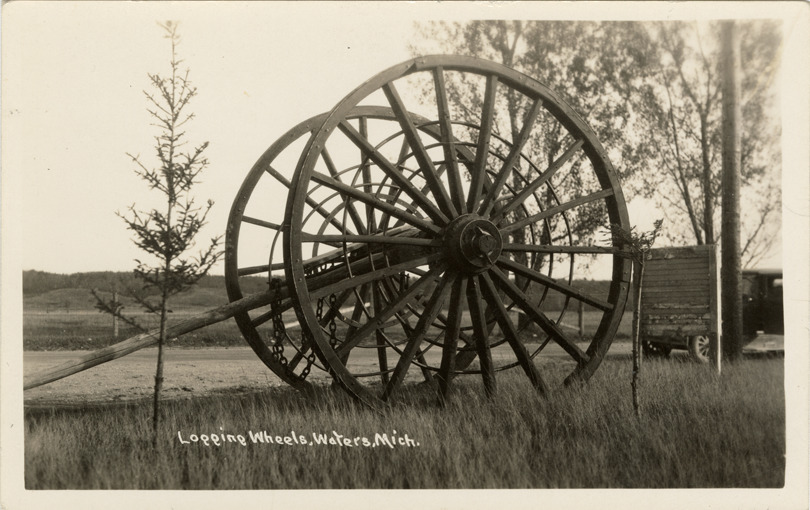 Favorite this☆ Logging wheels, Waters, Michigan Description: View of logging wheels in Waters, Michigan. Printed on front: "Logging wheels, Waters, Mich." Details Resource ID: bh022536 Subject: Wagons--Wheels Log transportation--Michigan--Waters Logging--Michigan--Waters Photographic prints Postcards Date Issued: Unknown year Format: 1 postcard ; 3.5 x 5.5 in. Member of: Burton Historical Collection Filing Location: M/Lumber industry and trade Rights: Physical rights are retained by DPL. Copyright is retained in accordance with U.S. copyright laws.