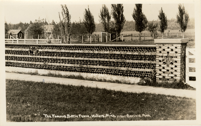 View of the bottle fence, constructed of empty bottles by Henry (Tom) Stephens, in Waters, Michigan. Printed on front: "The famous bottle fence, Waters, Mich. near Gaylord, Mich."