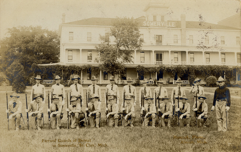 View of the Farrand Guards posing in front of the Somerville Hotel in St. Clair, Michigan. Printed on front: "Farrand Guards of Detroit at Somerville, St. Clair, Mich. Hancock, photo. Almont, Mich." Handwritten on back: "What do you think of this one. It is a little clearer. C.D.C." Card is postmarked July 15.