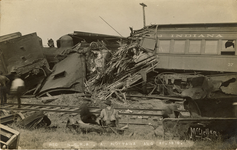View of onlookers with the wreck of a Grand Rapids & Indiana Railroad train at Nottawa, Michigan. Printed on front: "[W]rec[k] n G.R. & [I] a[t] Nottawa, Aug. 21, 1910. McClellan." Printed on back: "H.L. McClellan, Mendon, Mich."