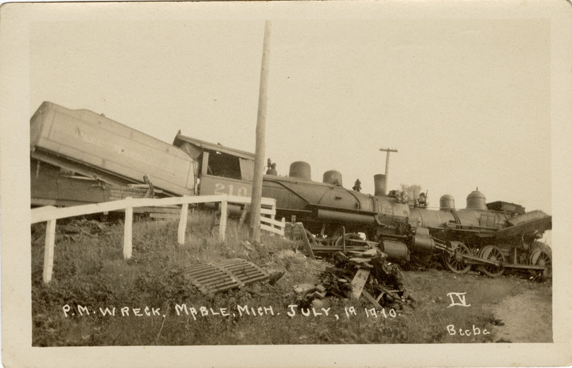 Favorite this☆ Wreck of Pere Marquette train, Mable, Michigan Description: View of onlookers posing with the wreck of a Pere Marquette Railroad train at Mable, Michigan. Printed on front: "P.M. wreck, Mable, Mich. July, 19, 1910. Beebe." Details Resource ID: bh022566 Creator: Beebe, Edward L. Subject: Railroad accidents--Michigan--Mable Pere Marquette Railroad Photographers--Michigan Photographic prints Postcards Date Issued: 1910-07-19 Format: 1 postcard ; 3.5 x 5.5 in. Member of: Burton Historical Collection Filing Location: M/Railroads Rights: Physical rights are retained by DPL. Copyright is retained in accordance with U.S. copyright laws.
