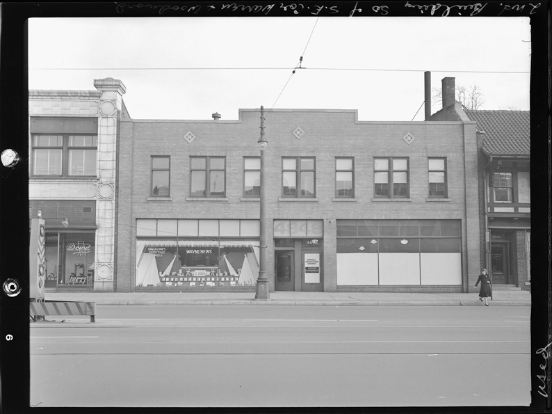 View of a two-story brick commercial building located at 4848 Woodward Ave. Building houses the Wayne News bookstore, Donnelly Manufacturing Company and Kushner Engineering Co. Handwritten on negative: "2nd. Building so. of S.E. cor. Warren & Woodward."