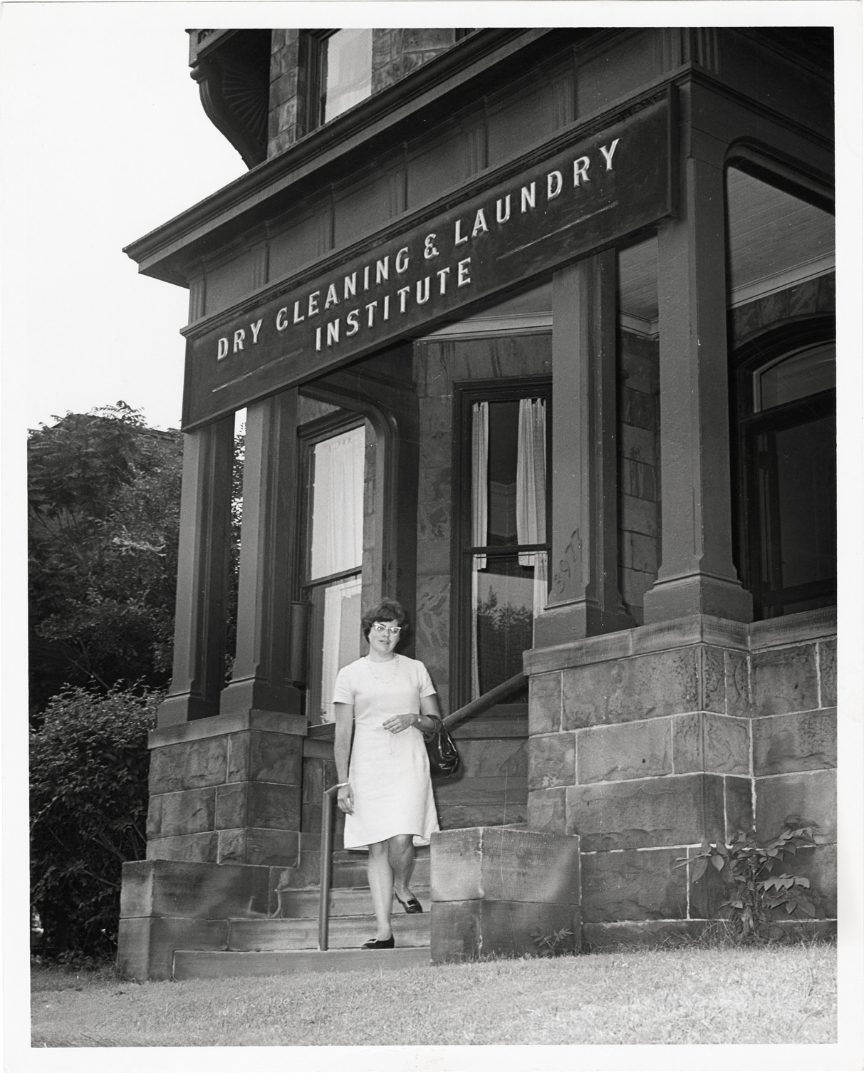 Woman exiting Dry Cleaning and Laundry Institute building
