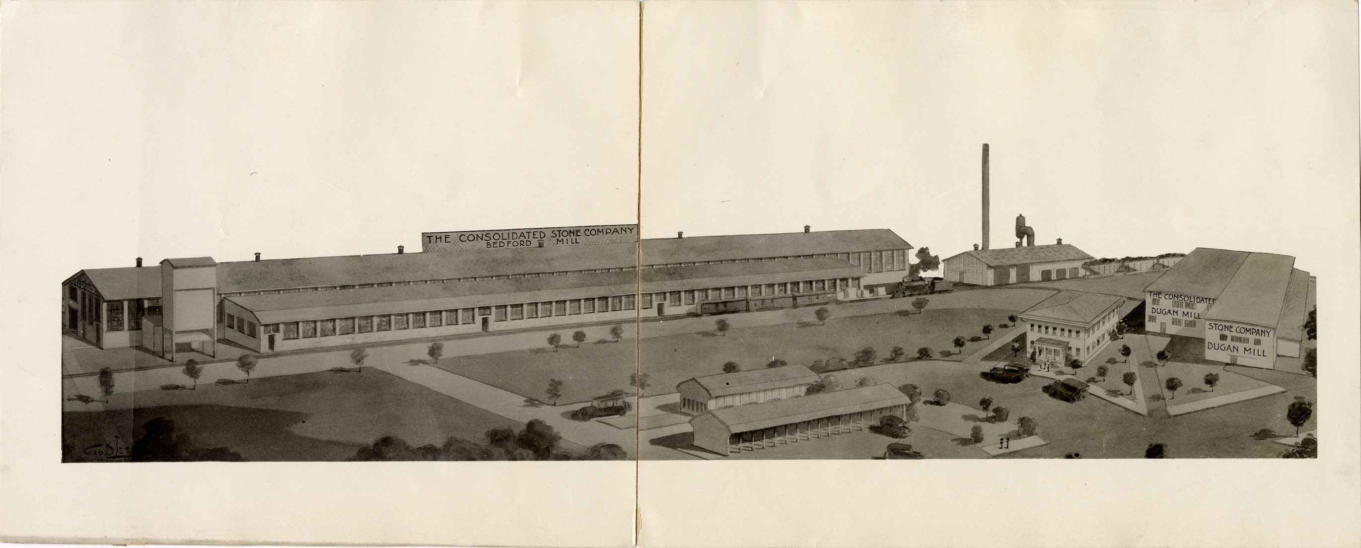 Artist's depiction of the Bedford Mill and Dugan Mill at the Consolidated Stone Company in Bedford, Indiana. Handwritten on back: "Dugan Mill, Bedford Mill, power house, office and garages of the Consolidated Stone Co., Bedford, Ind."
