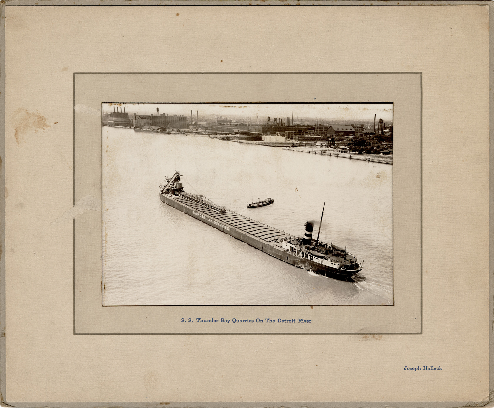 View of the freighter S.S. Thunder Bay Quarries. Printed on front: "S.S. Thunder Bay Quarries on the Detroit River. Joseph Halleck." Printed on back: "Ship. Thunder Bay Quarries. Self-loading bulk cargo carrier. Built 1910 at St. Clair Mich. Cap. 10,000 tons. Length 504 ft. b.p. Width 56 ft. Depth 30 ft. Power: 1,500 h.p. steam reciprocating. Engine driving single screw. Ross & Wiley, marine photographers. 6334 May Street, Chicago. Printed in U.S.A. 1932."