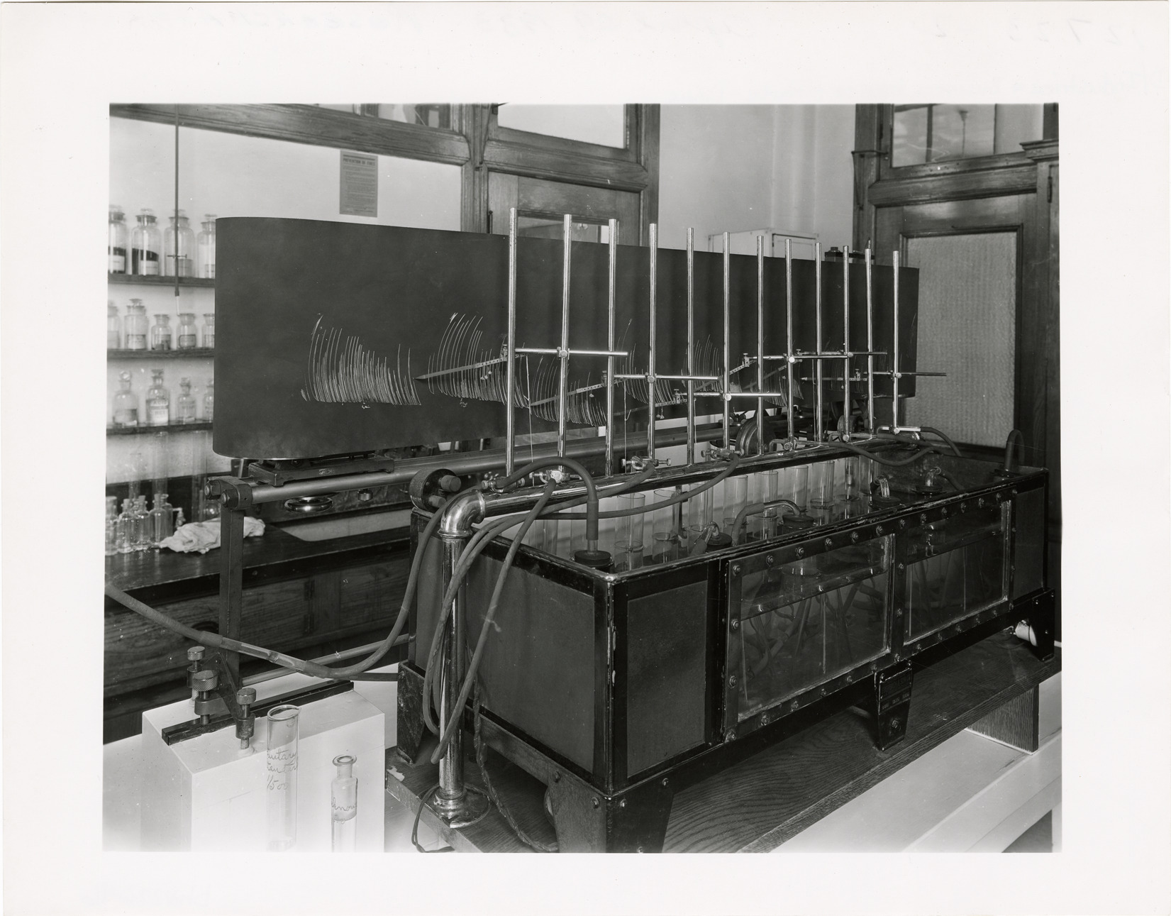 View of an apparatus in laboratory at Parke, Davis & Co. Handwritten on back: "Research apparatus."