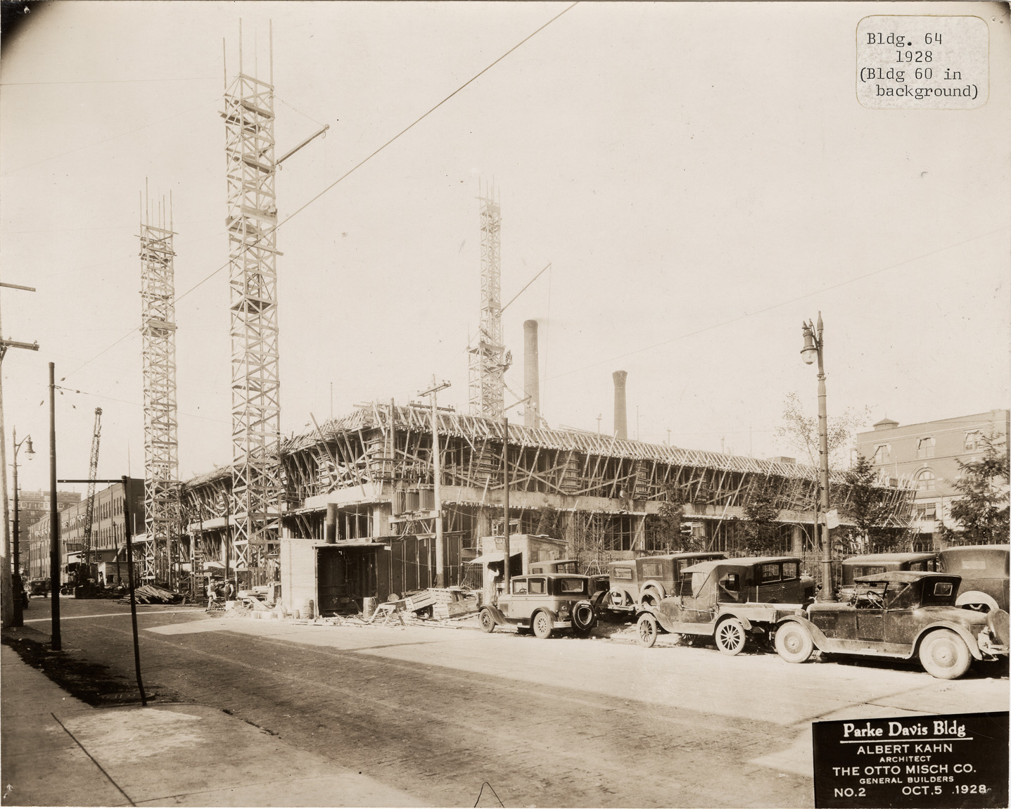 View of Parke, Davis & Co. building no. 64 during construction. Cars are parked in street. Printed on front: "Parke Davis Bldg. Albert Kahn, architect. The Otto Misch Co., general builders. No. 2. Oct. 5, 1928." Label on front: "Bldg. 64, 1928. (Bldg. 60 in background)." Stamped on back: "Kalec & Forster, 2539 Woodward Avenue, Detroit. Negative safely filed for reorders."