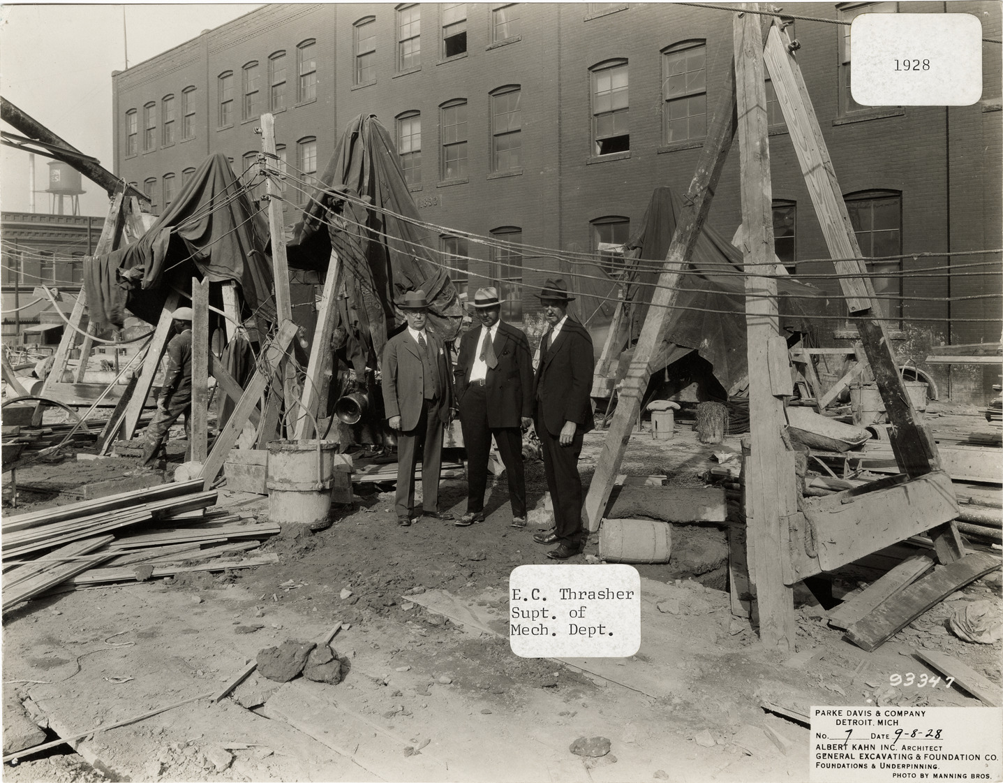 View of the E.C. Thrasher, Dr. Coleman and an unidentified man posing at the site of the foundation, Parke, Davis & Co. building during construction. Printed on front: "Parke Davis & Company, Detroit, Mich. No. 7. Date: 9-8-28. Albert Kahn Inc. architect. General Excavating & Foundation Co. Foundations & underpinning. Photo by Manning Bros." Labels on front: "E.C. Thrasher, Supt. of Mech. Dept." and "1928." Stamped on back: "Manning Bros., commercial photographers. 504-505 Lincoln Building. Corner State and Park Sts., Detroit, Mich." Handwritten on back: "Dr. Coleman, Mr. E.C. Thrasher."