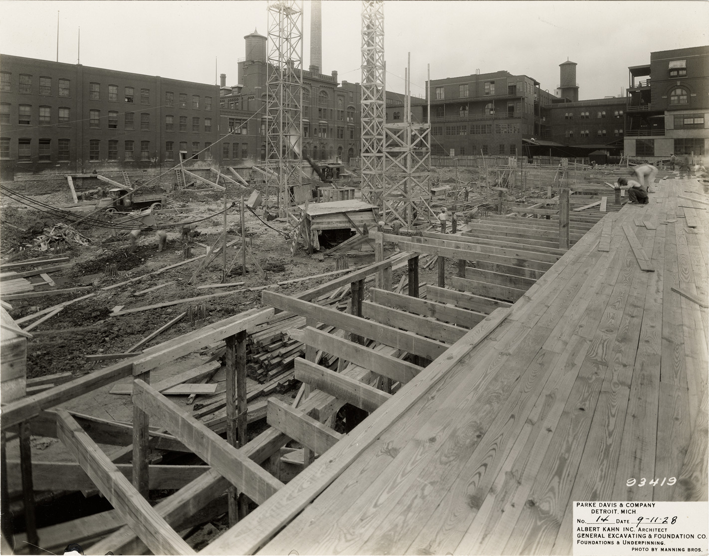 View of foundation construction for Parke, Davis & Co. building. Printed on front: "Parke Davis & Company, Detroit, Mich. No. 14. Date: 9-11-28. Albert Kahn Inc. architect. General Excavating & Foundation Co. Foundations & underpinning. Photo by Manning Bros."
