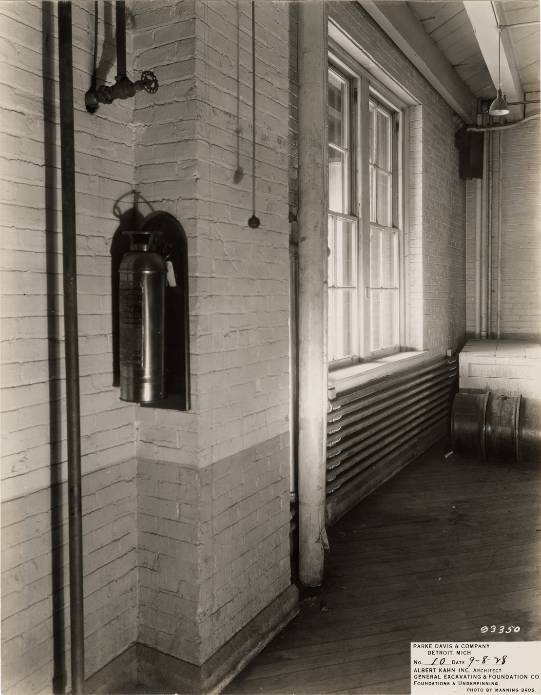 View of part of the building interior, Parke, Davis & Co. building during construction. Fire extinguisher on wall. Printed on front: "Parke Davis & Company, Detroit, Mich. No. 10. Date: 9-8-28. Albert Kahn Inc. architect. General Excavating & Foundation Co. Foundations & underpinning. Photo by Manning Bros."