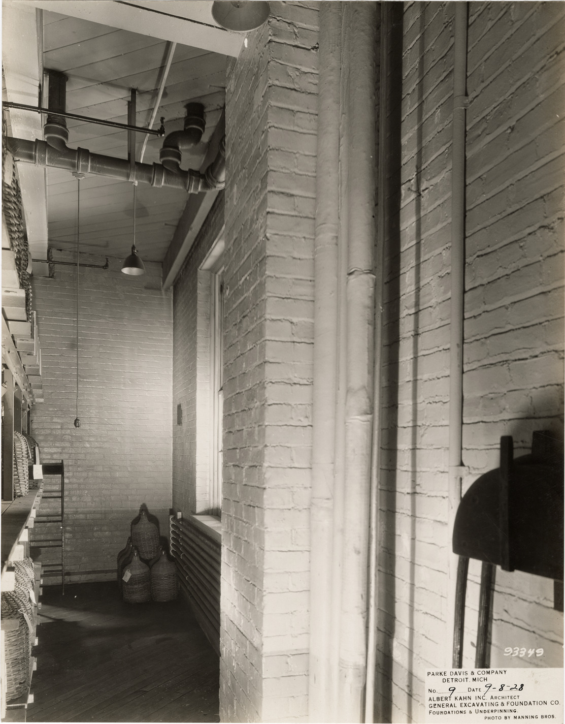 View of part of the building interior, Parke, Davis & Co. building during construction. Printed on front: "Parke Davis & Company, Detroit, Mich. No. 9. Date: 9-8-28. Albert Kahn Inc. architect. General Excavating & Foundation Co. Foundations & underpinning. Photo by Manning Bros."