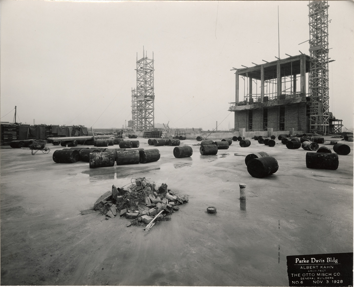 View of the roof of a Parke, Davis & Co. building during construction. Printed on front: "Parke Davis Bldg. Albert Kahn, architect. The Otto Misch Co., general builders. No. 6. Nov. 3, 1928." Stamped on back: "Kalec & Forster, 2539 Woodward Avenue, Detroit. Negative safely filed for reorders."
