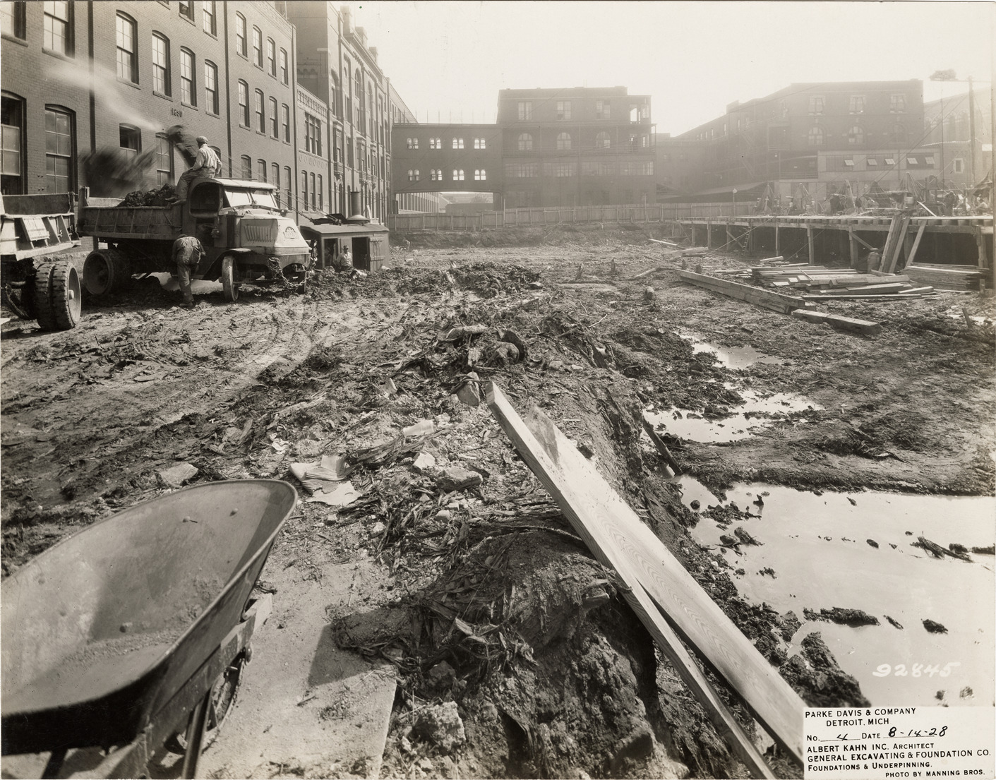 View of the foundation excavation for the Parke, Davis & Co. building. Workers with truck in background. Printed on front: "Parke Davis & Company, Detroit, Mich. No. 4. Date: 8-14-28. Albert Kahn Inc. architect. General Excavating & Foundation Co. Foundations & underpinning. Photo by Manning Bros."