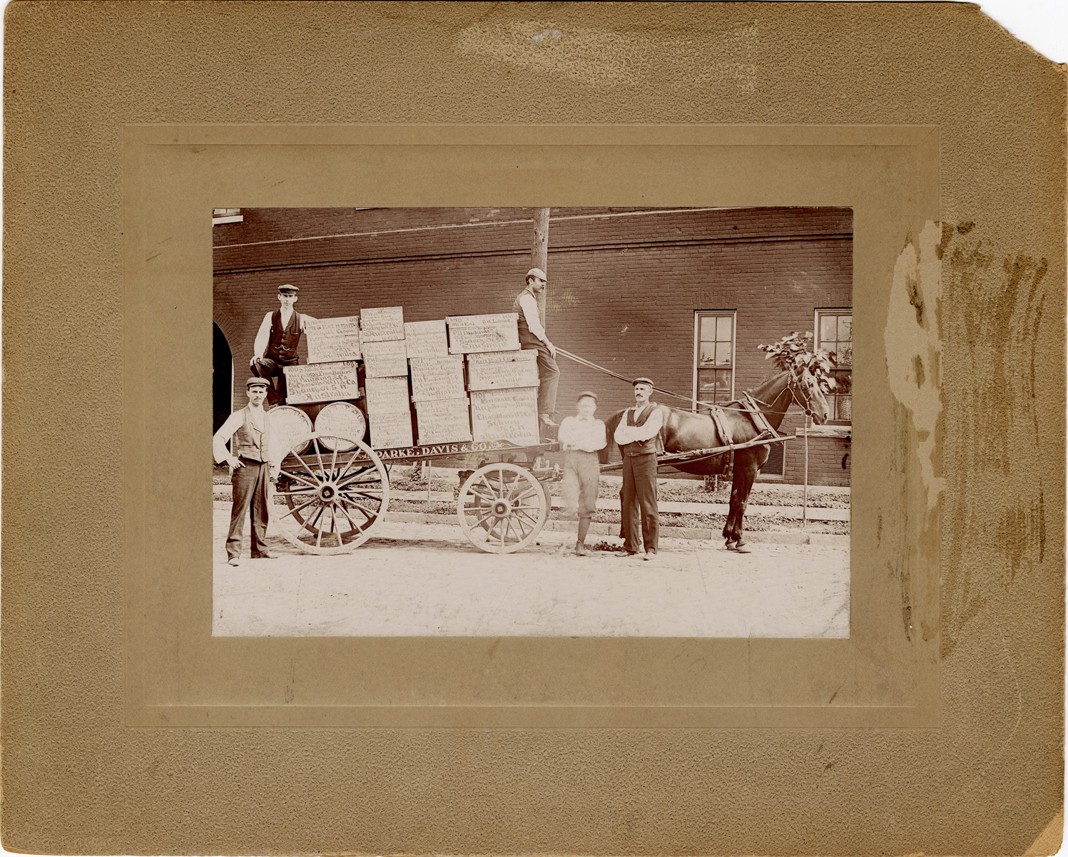 View of workers posing with a Parke, Davis & Company horse-drawn wagon. Wagon holds a shipment of boxes and barrels from Canada. Stamped on back: "Geo. Phillips, photographer." Handwritten on back: "First foreign shipment made from Canadian laboratory, Sept. 1898."