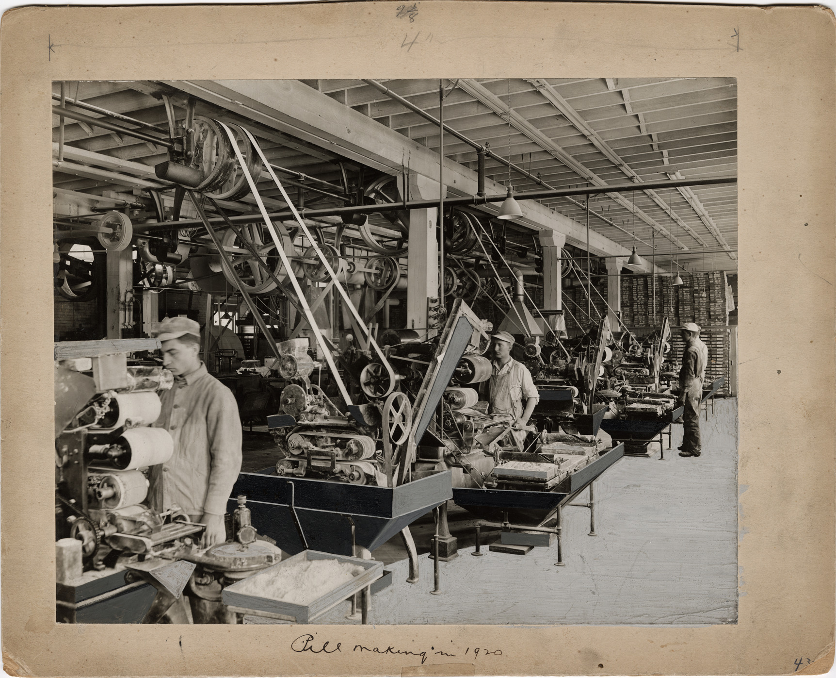 View of men manufacturing pills with machines at Parke, Davis & Co. Handwritten on front: "Pill making in 1920." Stamped on back: "Photographic illustrations by Hank Weber. Midwest 4-0221. Birmingham, Michigan."