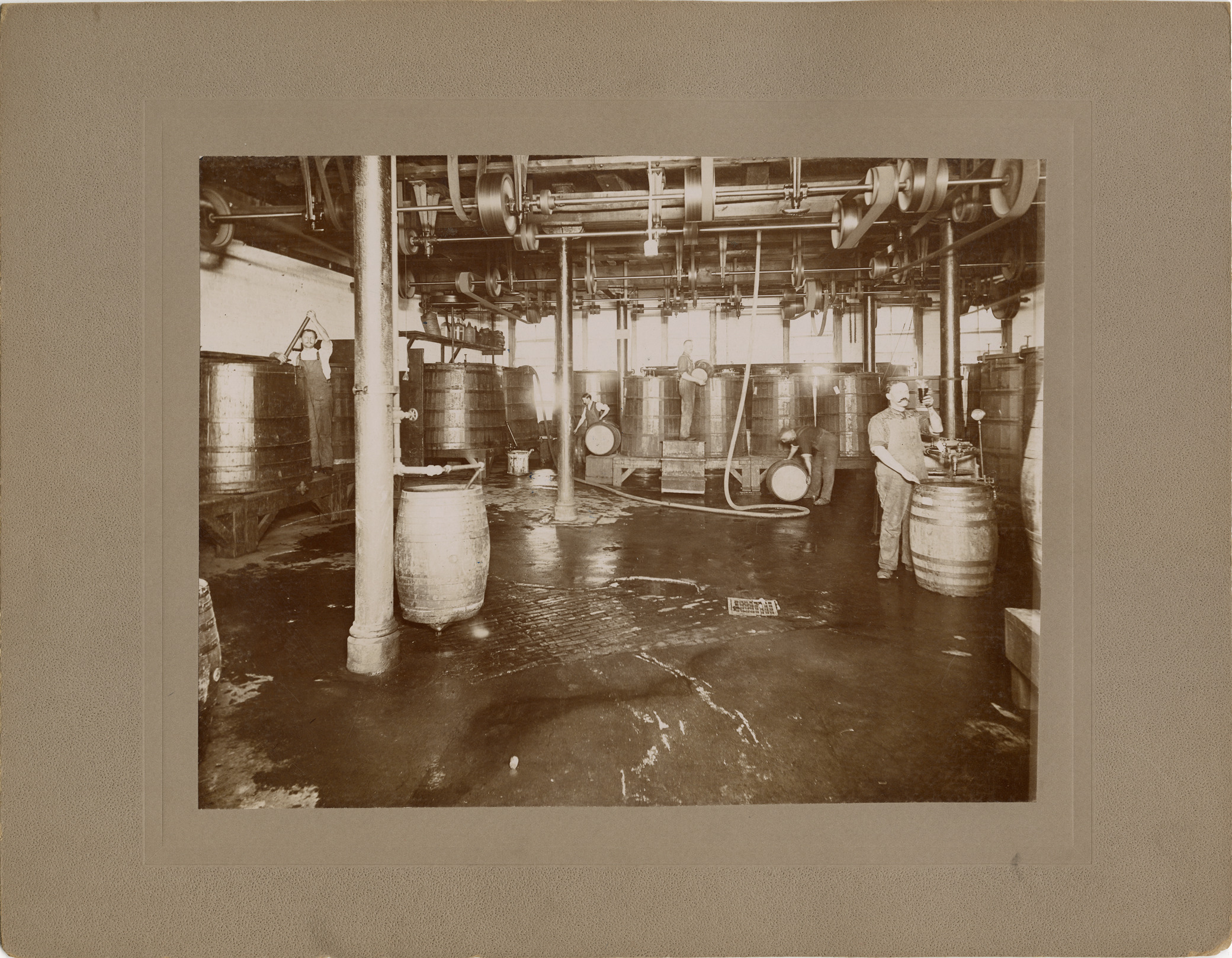 View of men posing with barrels and vats in the vat room of the General Pharmaceutical Dept. at Parke, Davis & Co. Label on back: "North-eastern section of the vat room of the General Pharmaceutical Department. The larger vats such as the one shown at the extreme left hold 1000 gallons. To the right is shown one of the large filter presses. With the assistance of the steam pump fluids can be rapidly filtered, which could scarcely be clarified by the ordinary method of filtration through paper." Stamped on back: "A. Godfrey & Co. Commercial photographers, 41 W. Fort Street, Detroit, Mich."