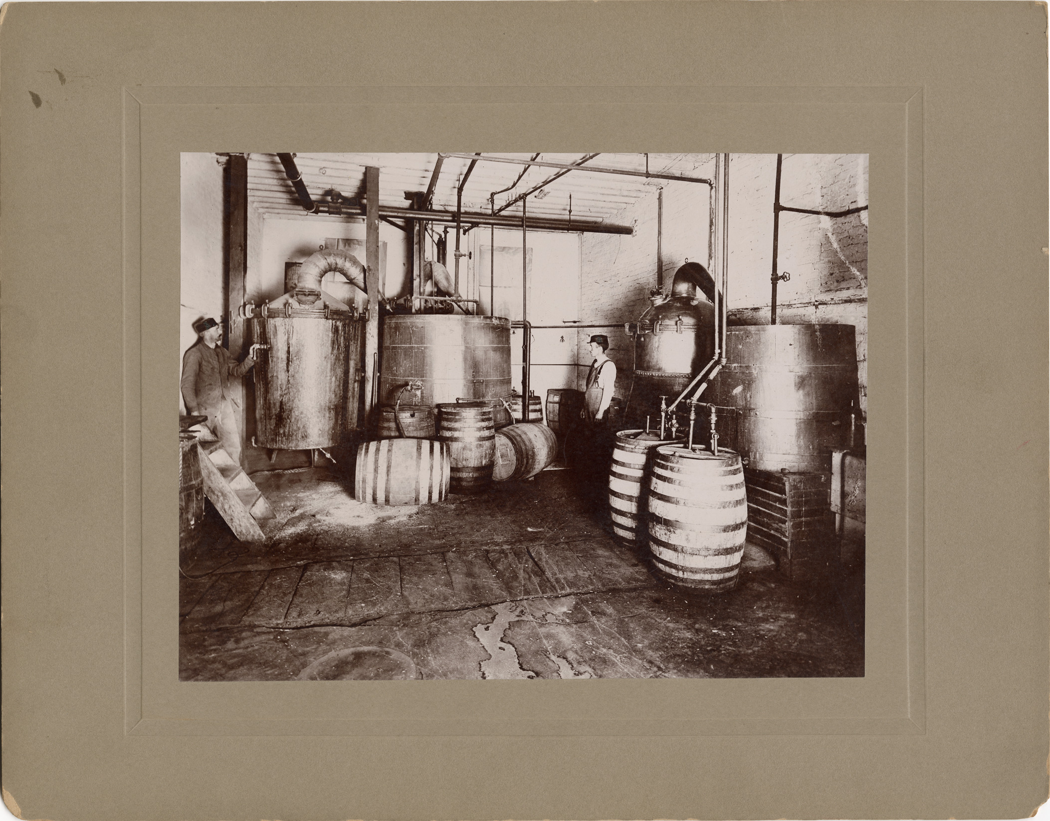 View of men posing with vats and barrels used in the distillation of alcohol at Parke, Davis & Co. Label on back: "Distilling room, recovery and purification of alcohol." Stamped on back: "A. Godfrey & Co. Commercial photographers, 41 W. Fort Street, Detroit, Mich."
