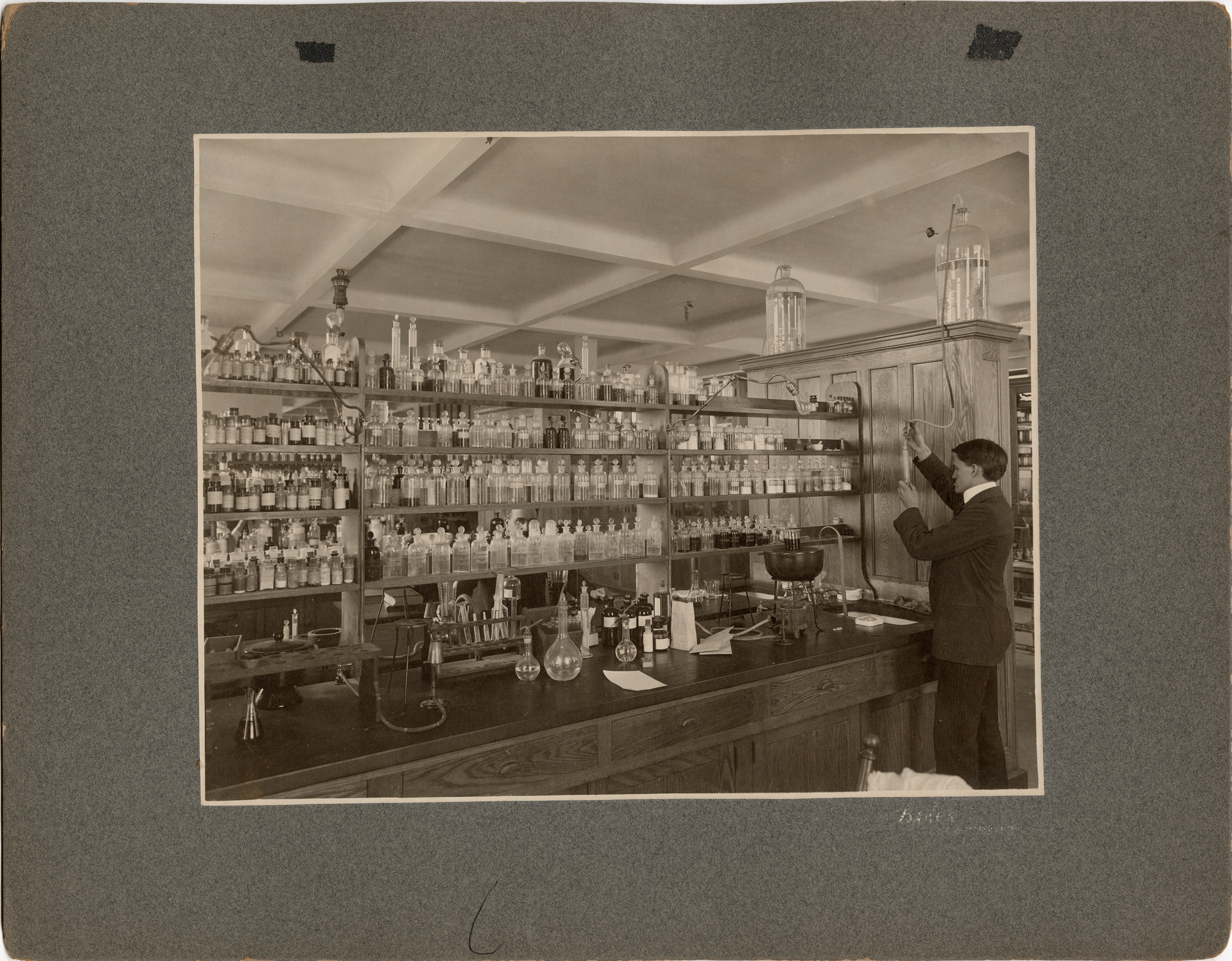 View a chemist working in laboratory at Parke, Davis & Co. Rows of bottles are displayed on shelves; beakers, tubes and other equipment are on counter. Label on back: "My first personal laboratory. Analytical Dept. The then new Scientific Building, date 1903."