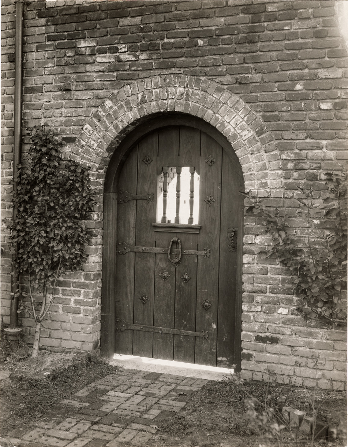 View of a wooden door at the Charles A. Dean house in Grosse Pointe Farms, Michigan, designed by architect Hugh Keyes. Stamped on back: "Thomas Ellison, photographer of architecture. 2744 W. Grand Boulevard, Detroit."