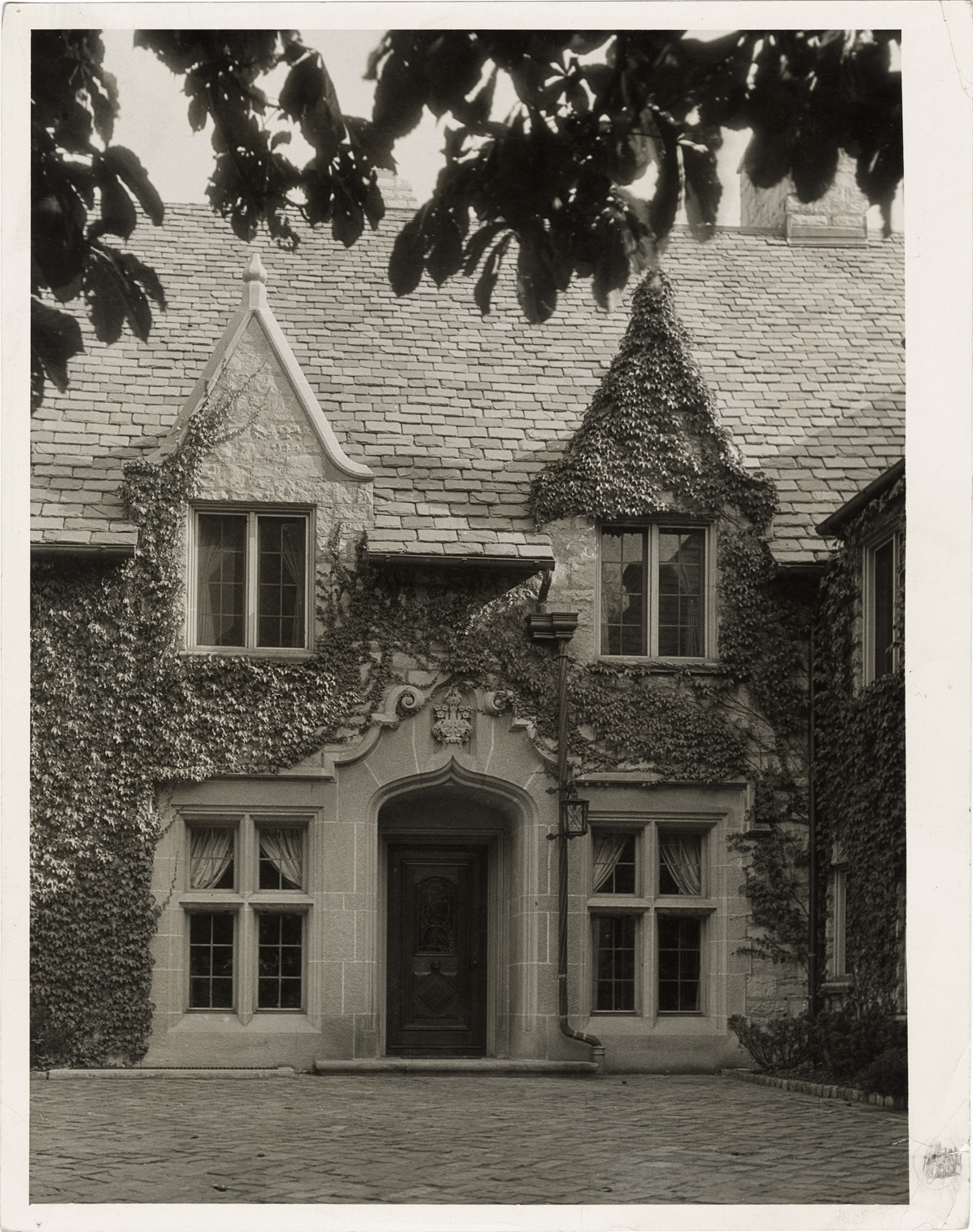 View of the main entrance to the Mrs. Francis Dwyer residence in Grosse Pointe Farms, Michigan, designed by architect Hugh Keyes. Label on back: "Mrs. Francis Dwyer res. Grosse Pointe Farms, Michigan. Main entrance." Stamped on back: "Photograph by Elmer L. Astleford." Handwritten on back: "Main entrance, Mrs. Francis Dwyer."