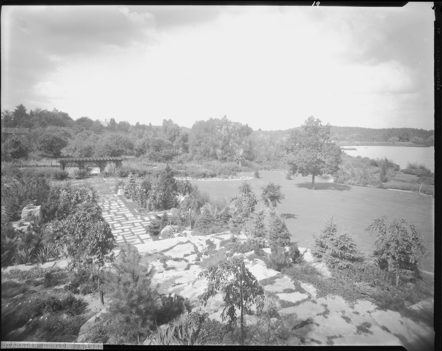 View of the garden and grounds of the Albert J. Stahelin house in Bloomfield Hills, Michigan, designed by George D. Mason & Co. Printed on negative: "Stahelin residence, 1925."
