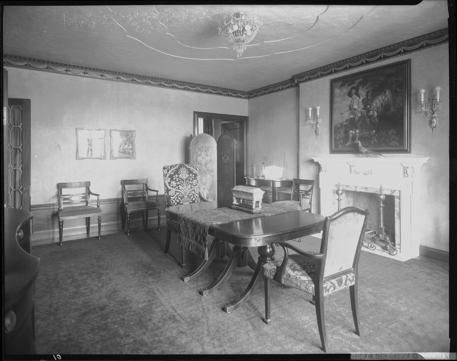 View of the dining room in the Albert J. Stahelin house in Bloomfield Hills, Michigan, designed by George D. Mason & Co. Fireplace on left; painting over mantel. Room is furnished with table and chairs. Printed on negative: "Stahelin residence, 1925."