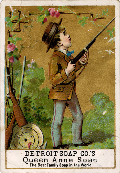 View of an advertising card for the Detroit Soap Co., depicting a young boy dressed as a hunter and carrying a rifle. Rifles and target in foreground. Printed on front: "Detroit Soap Co.'s Queen Anne soap. The best family soap in the world."