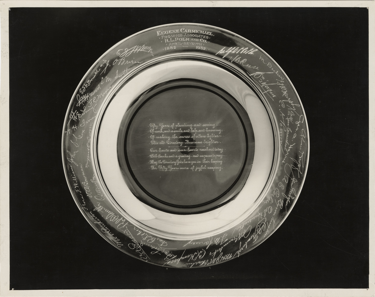 View of a commemorative plate presented to Eugene Carmichael from colleagues at R.L. Polk & Co. on the occasion of his retirement. Inscribed on plate: "Eugene Carmichael from his associates, R.L. Polk & Co., April seventh, 1882-1932. The years of planting and sowing; of work, and a smile, and help, and knowing; of making the cares of others lighter; this old directory business brighter. Our hands and our hearts reach out today; with thanks and a greeting and we pause to pray; may the directory gods have you in their keeping; for fifty years more of joyful reaping." Signatures inscribed on plate rim.