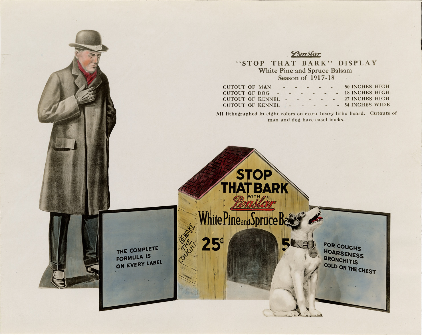 View of an advertising display for the cough suppressant Penslar white pine and spruce balsam, depicting a man looking at a dog in front of a doghouse. Printed on front: "Stop that bark with Penslar white pine and spruce balsam, for coughs, hoarseness, bronchitis, cold on the chest. Beware the cough! 25 [cents]. The complete formula is on every label. Penslar 'Stop that bark' display, white pine and spruce balsam, season of 1917-18. Cutout of man, 50 inches high. Cutout of dog, 18 inches high. Cutout of kennel, 27 inches high. Cutout of kennel, 54 inches wide. All lithographed in eight colors on extra heavy litho board. Cutouts of man and dog have easel backs."